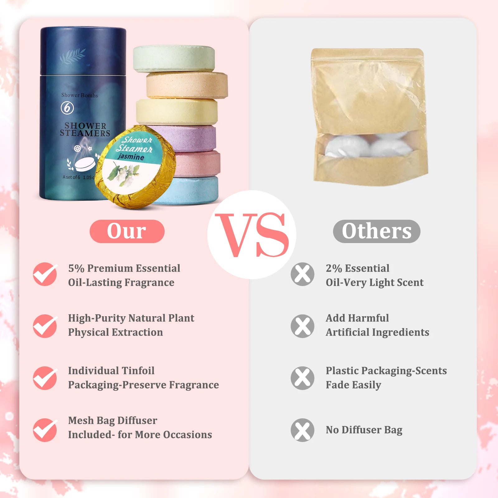 Elevate your shower routine with our luxurious Shower Steamers, crafted with 100% organic and natural fragrances. Each steamer releases aromatic essential oils that fill your shower with therapeutic scents, creating a rejuvenating spa experience in the comfort of your own home.